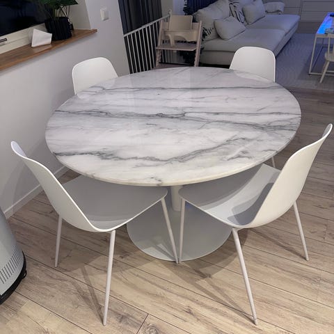 Säljer ett stilrent och exklusivt matbord i äkta marmor. Tidlös design med 2 stycken marmorskivor. Bordet har några fläckar, men de går att åtgärda. Se bilder för detaljer.