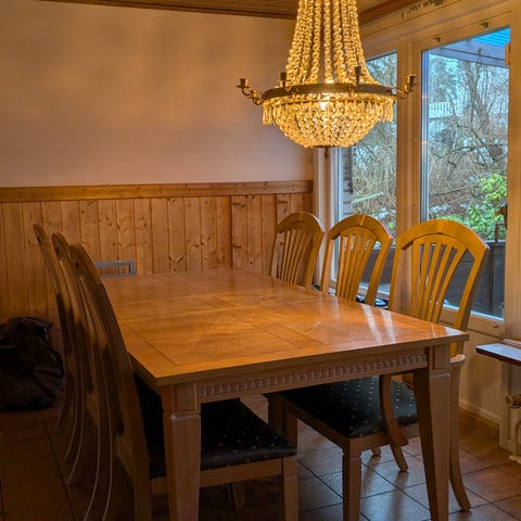 Massivt bord i trä (egenbyggt) med 6 stolar. Bra skick men behöver ev slipas och behandlas för en snyggare finish.