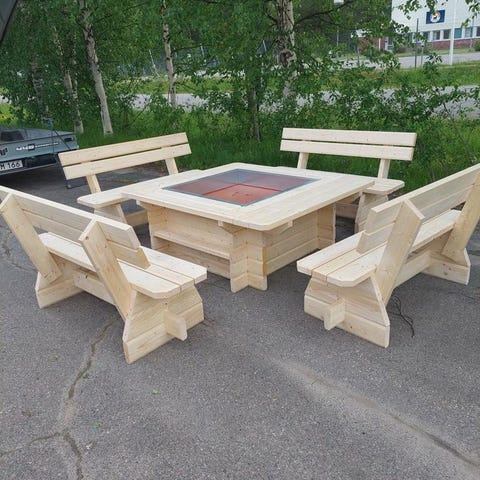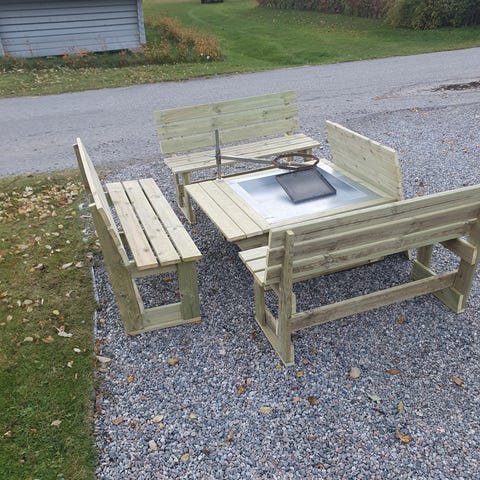 Knuttimrad eldstad med plåtinsats virke 145 x 45 mm yttermått 130 x 130 cm h 60 cm tryckat mot marken med grillanordning pris 4800 kr Bänkar 150 cm sittbredd 800 kr st tel 0738166620 Hemleverans Pitebygden utan kostnad