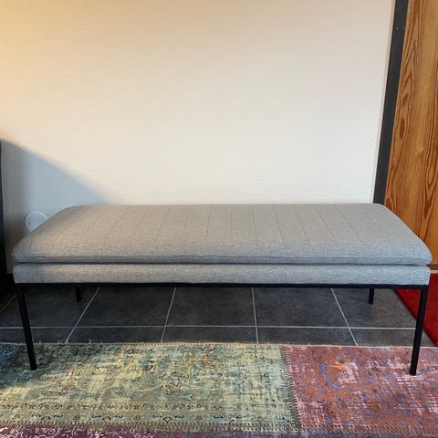 Grå sittbänk med förvaring, troligen från Ikea eller Jysk. Mått: 143 cm bred, 45 cm hög, 48 cm sitsdjup och 15 cm låddjup.