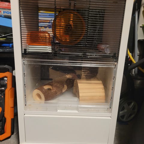 En bur till dvärghamstrar med tillbehör till buren, samt strö, sand och mat. Buren är välanvänd och har några skavanker, men fungerar bra. Våra dvärghamstrar trivdes bra i den.