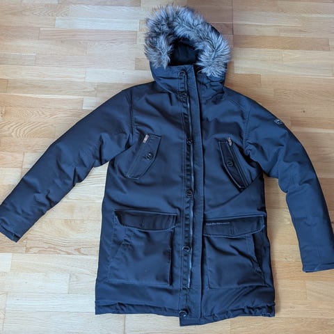 Varm och skön Peak Performance svart dun-parkas i storlek M. Avtagbar krage i fuskpäls. Knappt använd.