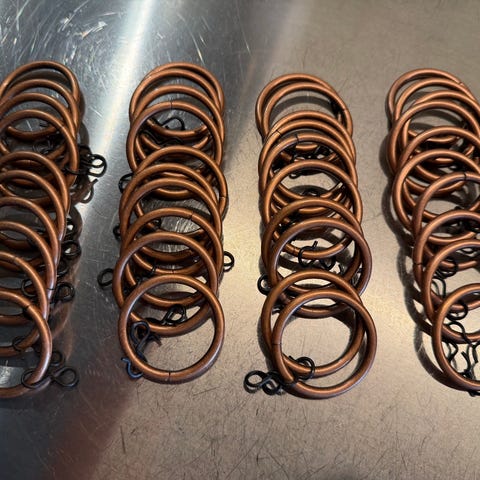 49 eller 50 gardinringar (plastik, ser ut som träd, 50 cm diameter) med metallklämma.
