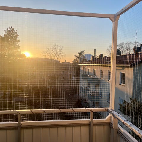 Stabil trappa till katt. Trapp-delen har gångjärn och går att vinkla. Trappan fästes enkelt med ett fåtal skruvar, vilket gör minimal åverkan på fönster/ fasad. Du kan såga av trappa och stolpe i rätt höjd för ditt fönster. Fint skick, endast använd april-oktober.