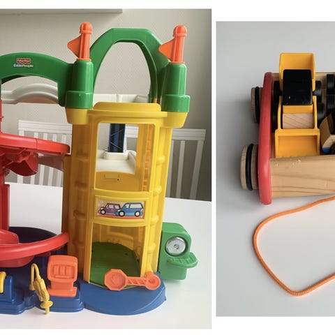 Fisher-Price radiostyrda bilar som pratar när de kör över vissa bitar i bilbanan och garaget. Nypris ca 3000kr!
