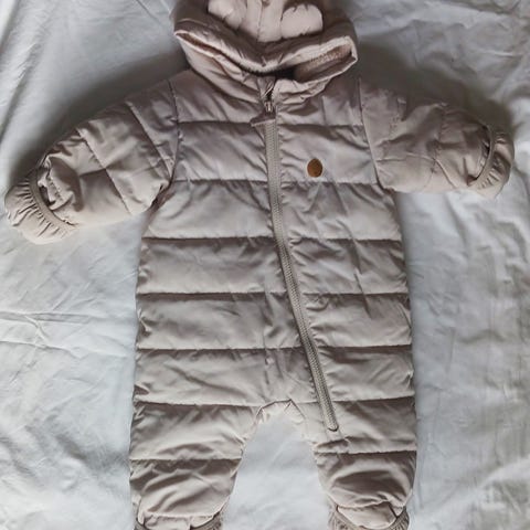 Sparsamt använd vinteroverall av märket KetchK. Dragkedjor och tryckknappar fungerar. Reflexband på höger ben. Resår under varje benöppning. Fint dekorativa broderier av röda lingon och blad runt axlarna. Huvan är avtagningsbar.