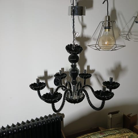Krona med fem ljuskällor och hängande glaspärlor. Passar för takmontering i rum som kräver dekorativ belysning.Takhöjden borde vara mer än 2.40. Färgen är genomskinlig med metallarmar.