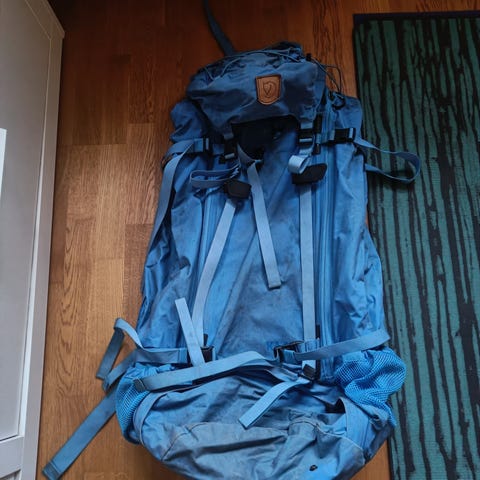 Fjällräven Kajka 75 ryggsäck i grön färg. Ryggsäcken är designad för vandring och friluftsliv med flera fack och justerbara remmar för komfort och funktionalitet.
