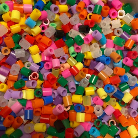 Hama pärlor i olika färger och former. Innehåller flera färger av små pärlor och sju pärlplattor för att skapa mönster. Material av plast.
