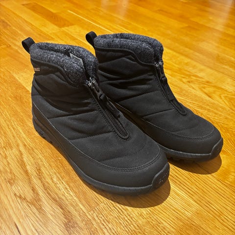 Ovanligt "normalt utseende" för att vara Icebug dubbskor. Svart nubuck, ullsula (woolpower) o tunnt foder (lite luddigt, oklart om det är ull det med). Strl 41,5 (26,5 cm), välbehållna dubbar. Sparsamt använda pga aningen för liten storlek, har mest stått o samlat damm.