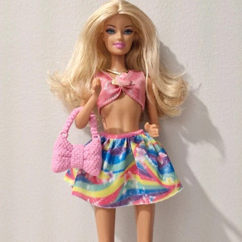 Barbie docka med rosa och lila kläder, inklusive byxor och topp med leopardmönster. Dockan har långt rosa hår och medföljer gör en rosa resväska med olika klistermärken, en gul nackkudde, ett par gula solglasögon och en liten accessoar. Passar för barn som samlar på dockor eller leker med mode- och rese-tema.