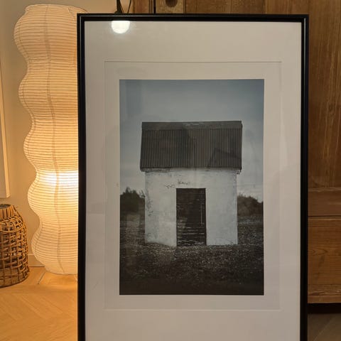 Russel James Fotoposter med svartvit porträttbild. Postern är inramad med svart ram och visar en person i kostym och slips. Passar som väggdekoration i olika miljöer.