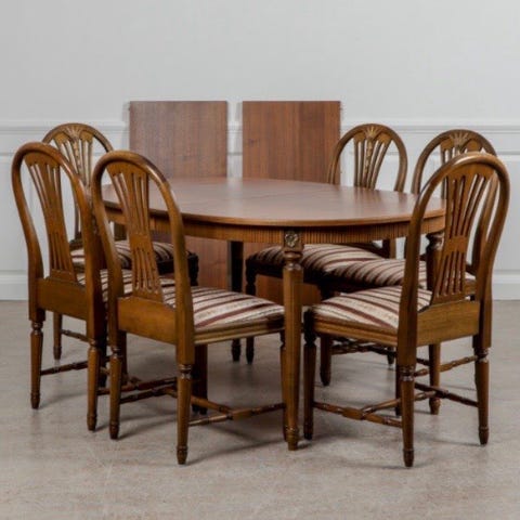 Detta är en matsalsgrupp i mycket hög kvalitet, säker 100år gammalt. Allt är lackat i vitt under glada 80-talet. Gruppen består av matbord dit det även finns en iläggsskiva, 6 stolar, linneskåp och byrå. Allt är i använt rustikt skick och i gedigen trä. För att flytta detta behövs absolut bärhjälp! En av stolarna är lätt skrapade på den vita färgen så man ser det ursprungliga bruna färgen under.