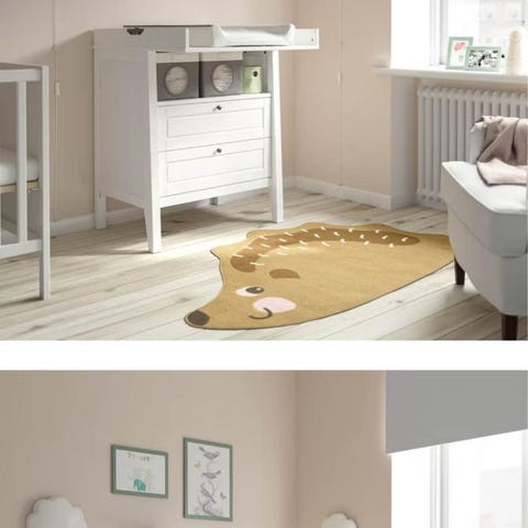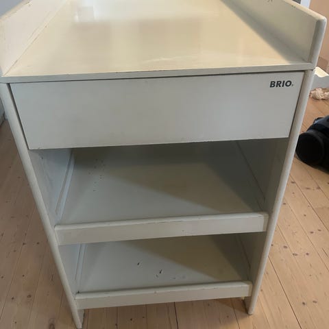 barnmöbel skötbord i vitt med en låda och två hyllplan för förvaring. Tillverkad i trä och designad för barnrum.