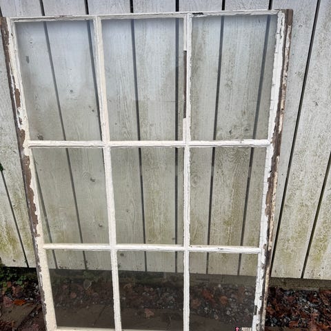Äldre fönster med spanjolett, öppnas inåt. Behöver renoveras.