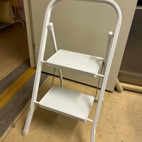 Trappstege i metall med vit sits och två steg. Stegen har en stabil konstruktion med kromade metallben och vit plastbeläggning på sits och steg. Passar för inomhusbruk vid behov av extra höjd för att nå högre ytor.