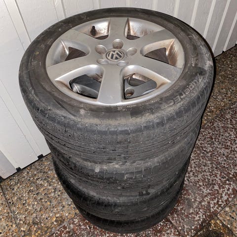 4 st Sommardäck med 17" Aluminiumfälgar som suttit på en Volvo Xc70 -07 3 jättebra däck 1 mindre bra fast lagligt. Finns i Töre Noll Sju Sex 8840484