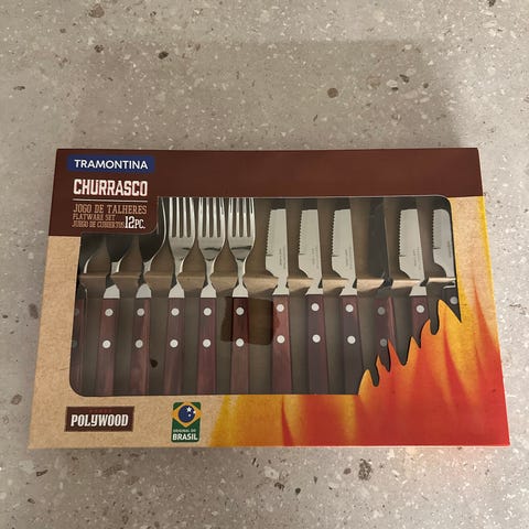 Grillgaffel och grillkniv från Tramontina. Tillverkad av polywood med aluminiumnitar och i rostfritt stål. Tål maskindisk. Priset är för ett 12-pack kniv och ett 12-pack gaffel. Önskas flera kniv och gaffel meddela mig.
