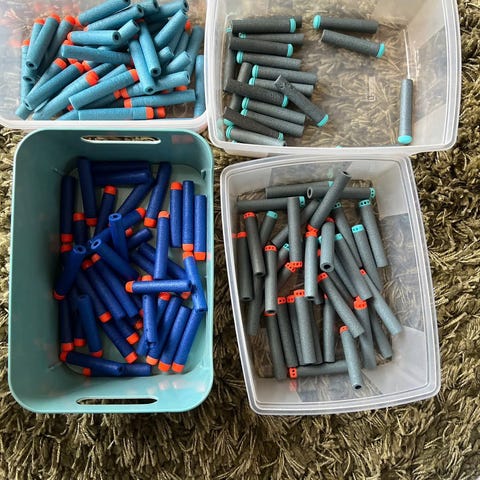 Nerf dartpistoler set bestående av flera blå och orange dartpistoler för lek. Finns bara 6 skott men det kan beställas separat på nätet. Därav priset för alla 3