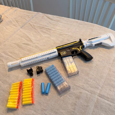 Det blå vapnet (N-Strike Elite Retaliator) går att ta isär och kan komponeras med andra Nerf-delar. Man kan även dra upp en liten flärp för förbättrat sikte (bild 4).