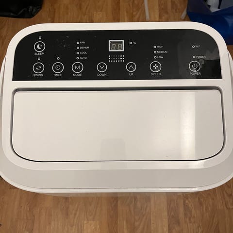 Andersson portabel luftkonditionering i vit färg med digital kontrollpanel och flera funktioner för justering av temperatur och fläkthastighet. Enheten är utrustad med avloppsslang och handtag för enkel förflyttning.