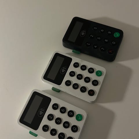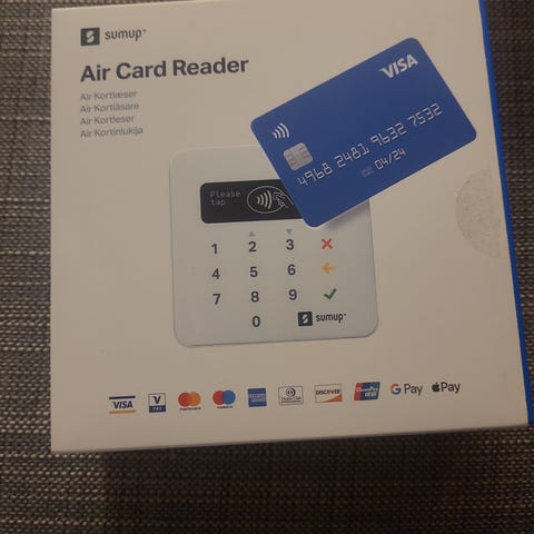 SumUp Air kortläsare i vit färg med display för kortbetalning, följer med kvittoskrivare och kvitto papper