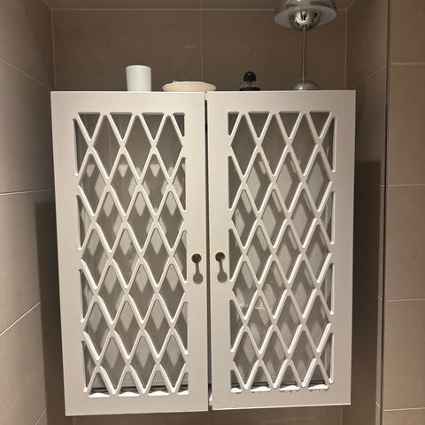 Två justerbara hyllor och skåpdörrar med Cam Cams ikoniska Harlequin-mönster och plexiglas på baksidan för att hålla damm borta.