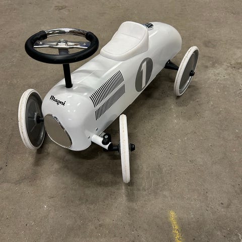 Mycket trevlig barnleksak i plåt med ratt och styrning på framhjul
