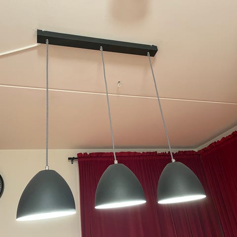 Säljer en vit takpendel från IKEA med tre separata sladdar/lamphållare – perfekt för köksö, matbord, sovrum eller hörn där du vill skapa en snygg ljusinstallation.