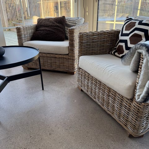 Lotta-fåtöljer visas här i brunlaserad, äkta rotting med en naturfärgad dyna och sidobordet Amanda. Rottingmöbler är självklara valet till inglasade uterum eller andra varma, soliga och taktäckta platser.