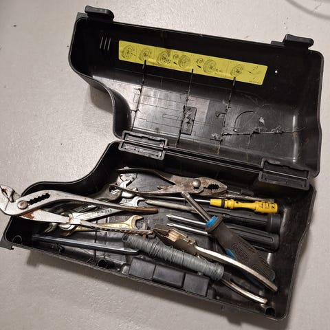 Lådan har flera fack för förvaring av verktyg och tillbehör.