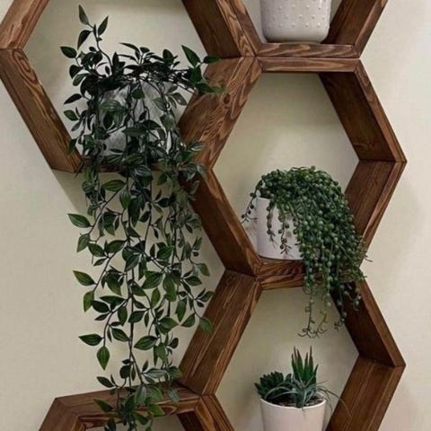 Sexkantiga hyllsystem för vägg. Finns med bränd eller betsad yta, efter önskemål.