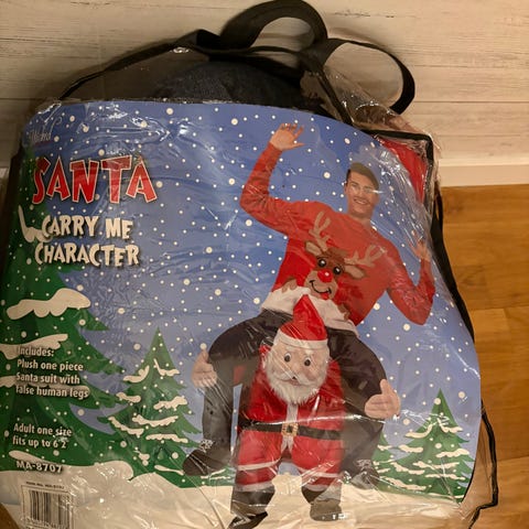 Röd unisex tomtedräkt med vit kant, bestående av jacka och byxor. Den passar nog de flesta, det finns dock inte någon specifikation på storlek.