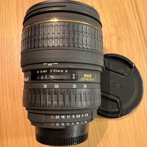 Oanvänd Zoom autofokus objektiv Sigma DG 28-300 till Nikon, 1:3,5-6,3, med UV filter Sunpak, C-P.L filter Sunpak samt prisma 1A filter