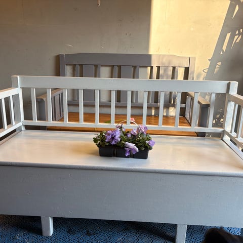 Stor grön kökssoffa i massivt trä (allmogestil) med förvaringsrum under sitsen. Mått: bredd 220 cm, höjd 98 cm, djup 55.5 cm, sitthöjd 50 cm, sittdjup 51 cm. Kan även fås i valfri mått och färg. Jag kör soffan hem till dig gratis om du bor i Stockholmsområdet (till gatuplan).