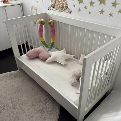 Ena sidan på sängen går att montera av och istället ersätta med juniorsidan när barnet blir äldre.