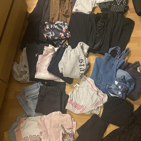 Klädpaket storlek 140-152. Dock grått linne i storlek 134. Främst från Zara. Plaggen har använts väl men har mycket kvar att ge. Svarta leggings har noppor. Blått linne har lite noppor. Några ljusa plagg kan ha några diffusa färgändringar eller liten fläck.