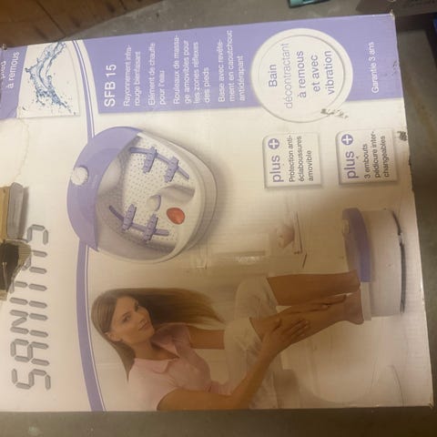 Beurer fotspa fotbad i vit och orange färg. Produkten är avsedd för fotvård och kan användas för att mjuka upp och rengöra fötterna.