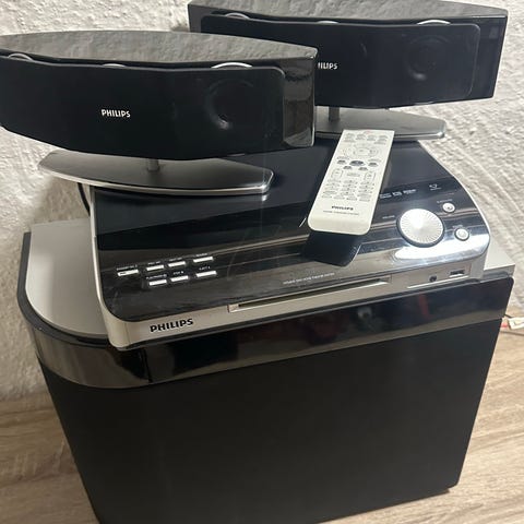 Säljer ett Philips HTS5591 5.1-surroundsystem med fyra golvhögtalare, center-högtalare, subwoofer & fjärrkontroll.