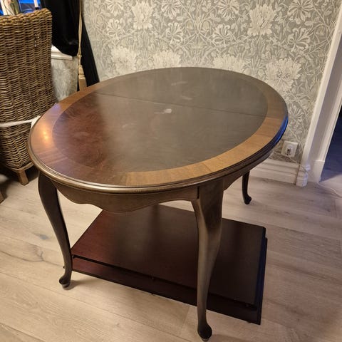Bordet är ca 6 år gamla. Bordsskivan skulle behöva en lätt avslipning och därefter behandling för att bli som nytt igen. Bordsskivan väger ca 85 kg men går bra att bära på två pers. Underredet går att skruva isär vid transport om man önskar.