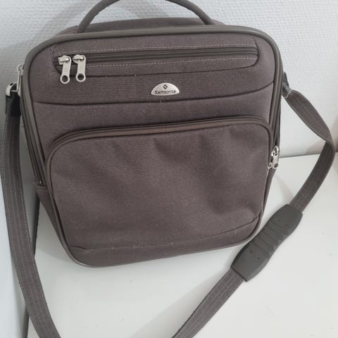Brun axelremsväska med justerbar svart rem (avtagbar) och flera fack med dragkedja.