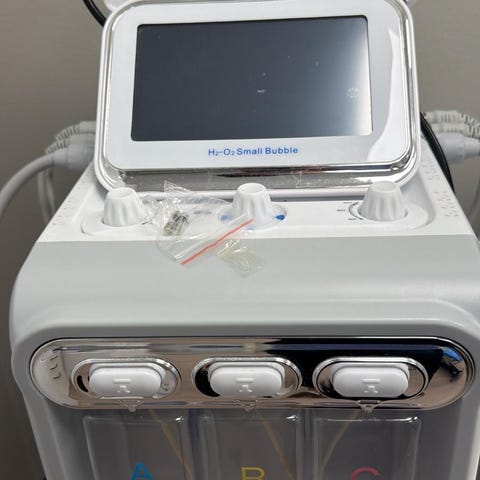 Ultrasonic Facial Treatment Machine med skärm och flera inställningar för hudvård. Utrustad med justerbara rattar och knappar för anpassad behandling. Används för professionell ansiktsbehandling och hudvårdsapplikationer.