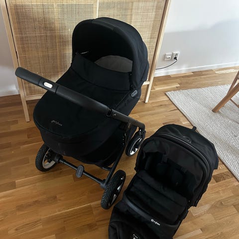 Cybex Priam Platinum barnvagn med sittdel (fällbar liggdel) köpt våren 2021. Färgen är svart med bruna läderdetaljer, justerbart handtag mm.
