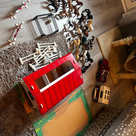 Säljer en schleichhäst och en häst av annat märke. 5 st täcke till hästarna och två sadlar och två träns. Annonsen finns på fler sidor. Hämtas i Vellinge. 150kr