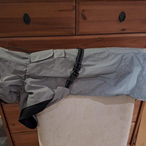 De gula partierna ger ökad synlighet i skymningsljus och kantbanden med reflextrådar tillsammans med reflextyget hjälper till när det är som mörkast. Vattentätt. Fodrad med smidig polyesterfleece för att ge värme och samtidigt behålla smidigheten. Hål i kragen för halsband och stolpficka på ryggen för sele.