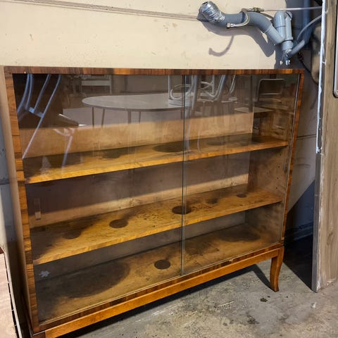 Två vackra dropplampor infattade i mässing. Höjdens mått är inkl. lampor. Dessa kan plockas bort (utan att det syns) och man får då en helt plan möbel, upptill.