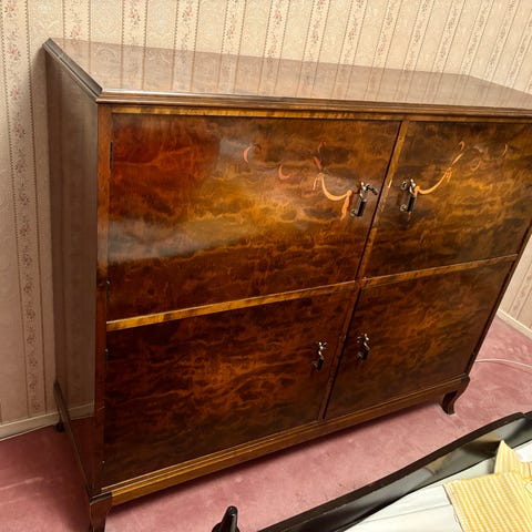 Fantastiskt hallskåp i ljus mahogny, massiva delar och lådor i ek. 8 lådor med zinkade kanter. Därtill ett fack under hyllan i mitten. Mässingsdetaljer och intarsia, fina fasett-slipade speglar, den stora utbytt på 1980-talet med ny tillverkad i England.