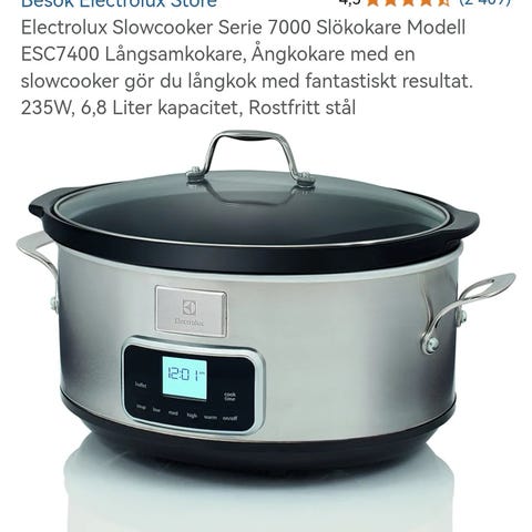 Crock-Pot Express Crock Multi Cooker med rostfri stålyta och digital kontrollpanel. Inkluderar innergryta med non-stick-beläggning samt ångrack. Lämplig för olika matlagningsmetoder som tryckkokning och långsam tillagning.
