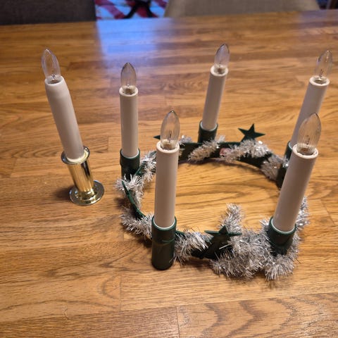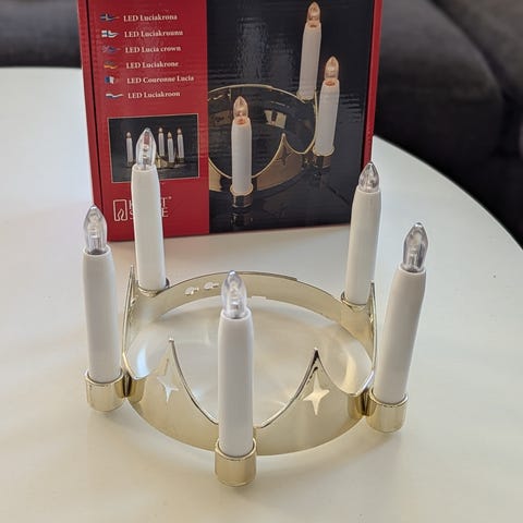 Säljer två luciakronor, har använt den ena som reservdel, skulle kalla det 1 fullständig Luciakrona. Det är ena ljuset som jag inte fått att fungera/lysa. En person med mer tålamod kan kanske fixa det.