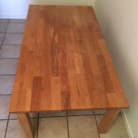 Hemmagjutet soffbord, med lekablock som ben. Ca 7 år, vilket gett skivan en patina med lite fläckar osv. Kan säkert slipas och behandlas om man inte uppskattar det. Fungerar även att ha utomhus.